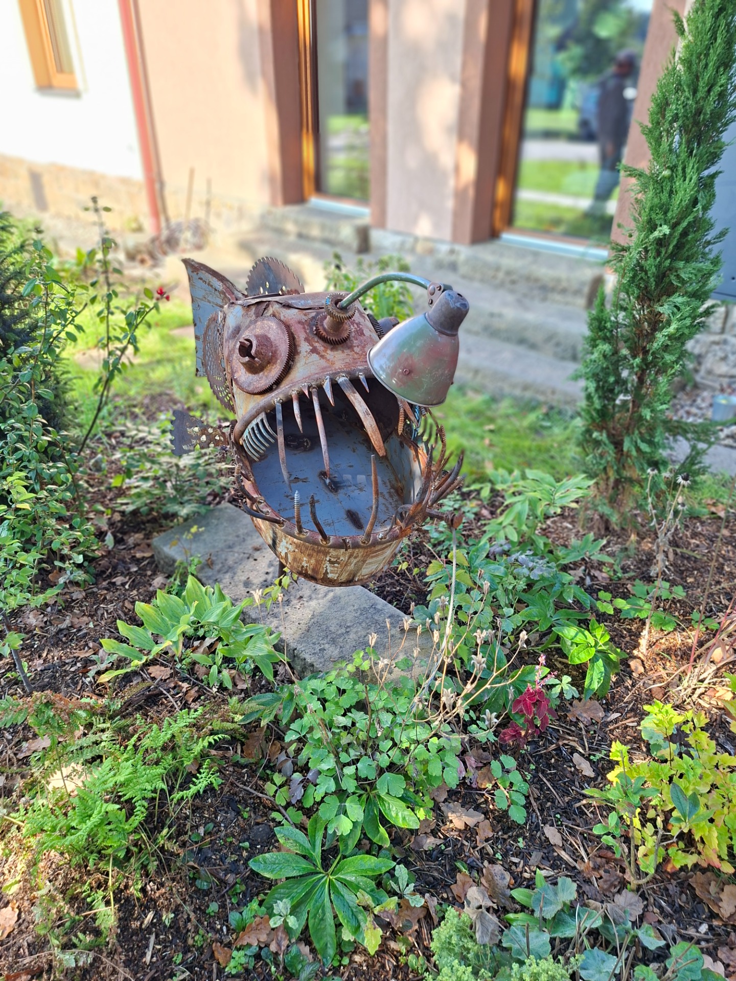 Novostavba ze starého kamene, zdivo na vlasovou spáru, oštění a futra z nového kamene, plastika madony.
